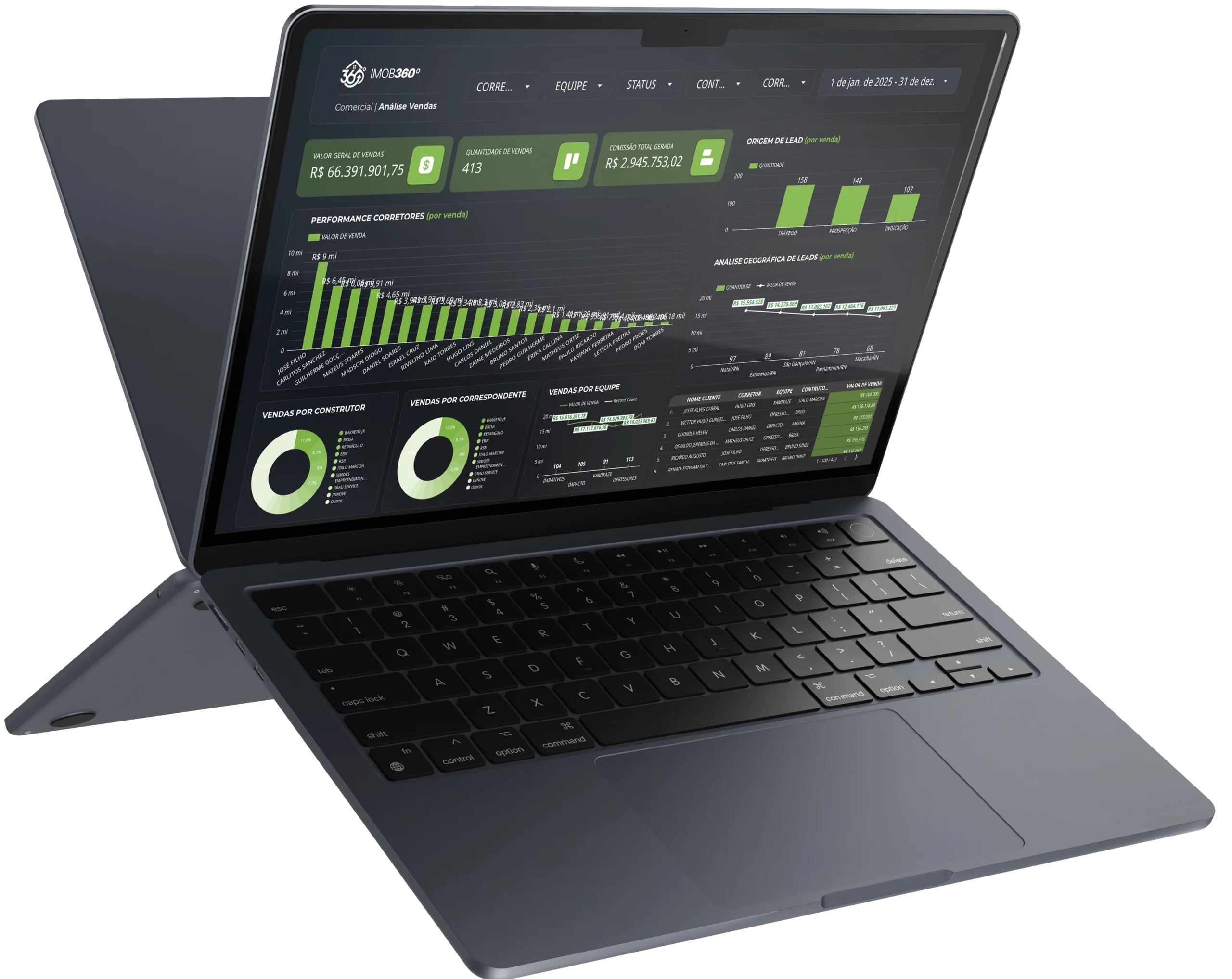 Mostra o volume de vendas, evolução por período e desempenho por corretor, ajudando a identificar o que está convertendo melhor.